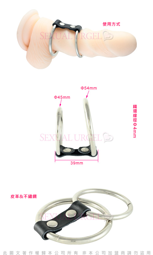 .本品由不銹鋼與皮革製作,由一大一小兩隻陽具環組成,並以皮革扣帶相連