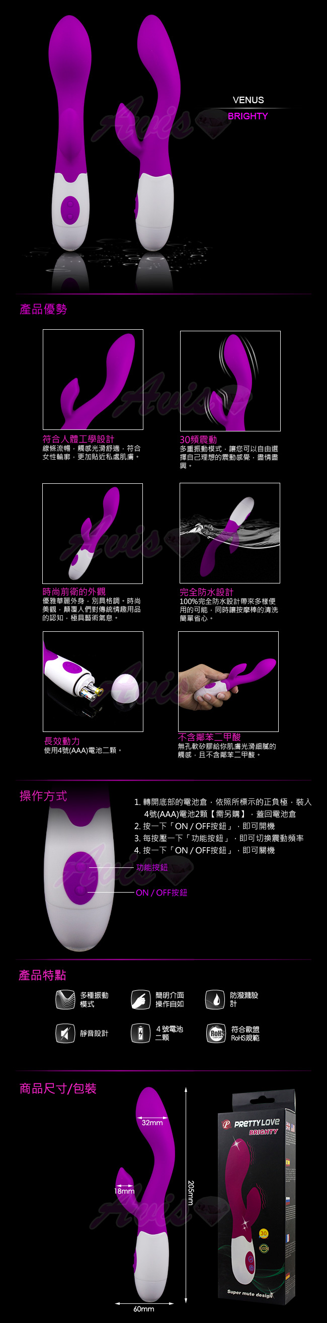 雙馬達設計,動力更強勁,產品內部置有兩個馬達,頭部進入蜜穴的同時,外部震動馬達可以同時刺激外陰,內外夾擊,潮吹一觸即發