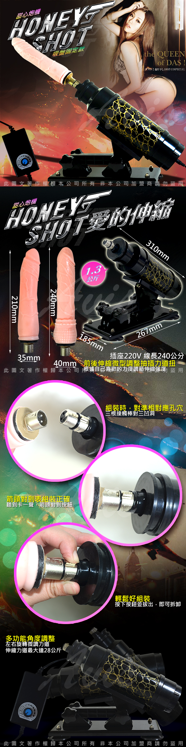 .主商品:無敵大砲台 女用+同志用 全自動伸縮抽插 性愛機器砲機 附仿真陽具棒x2 (吸盤固定款)