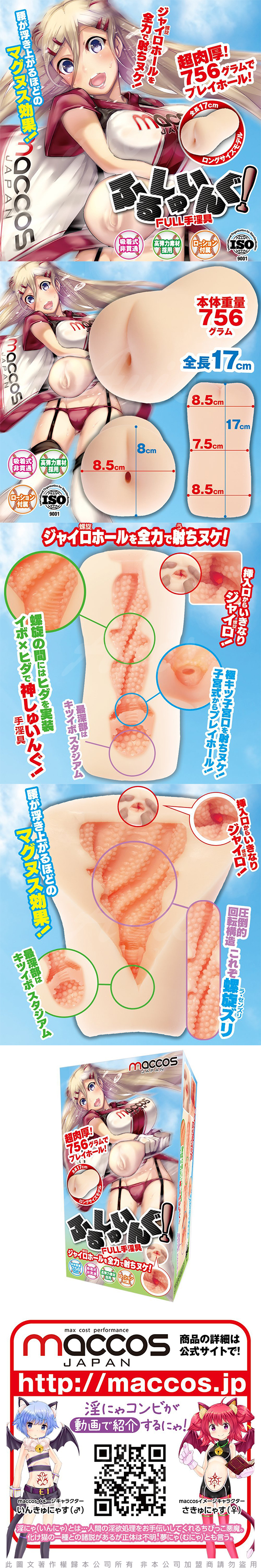 以最各種最受歡迎的特性,螺旋,高密度突點和子宮結構組合,紋路分明,刻畫清晰,舖排合理,加上重達756G超肉厚感,基本上已經「無得輸」。素材擁有相當高的彈力,耐久度高,集肉感,刺激感,舒適感和子宮突入於一身,尤如全壘打毎個壘也染指。生產商Maccos著重高性價比,肉厚度可以是同價錢產品的兩倍,而且包裝,設計,素材,紋路各方面也一絲不苟,絕對值得支持!