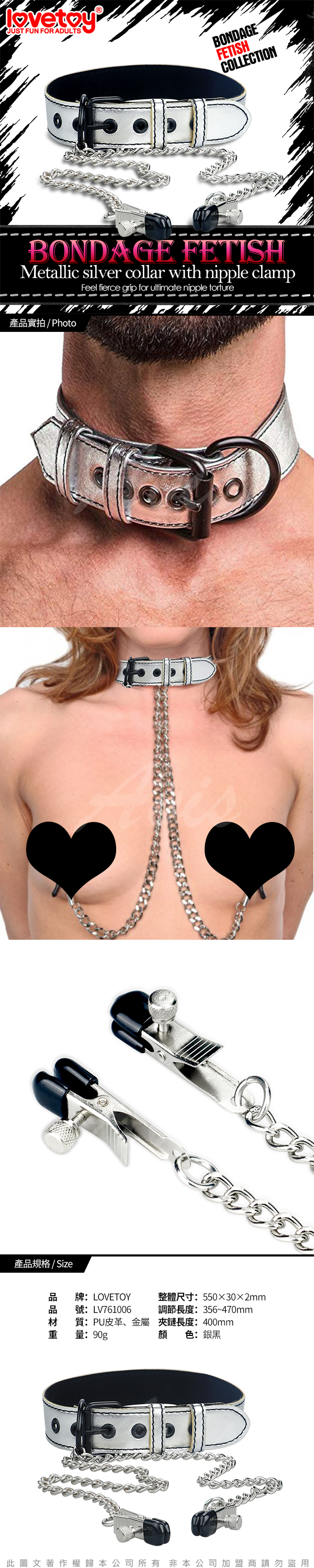 .商品內容:Lovetoy BONDAGE FETISH 虐戀系列-皮革頸套+乳夾