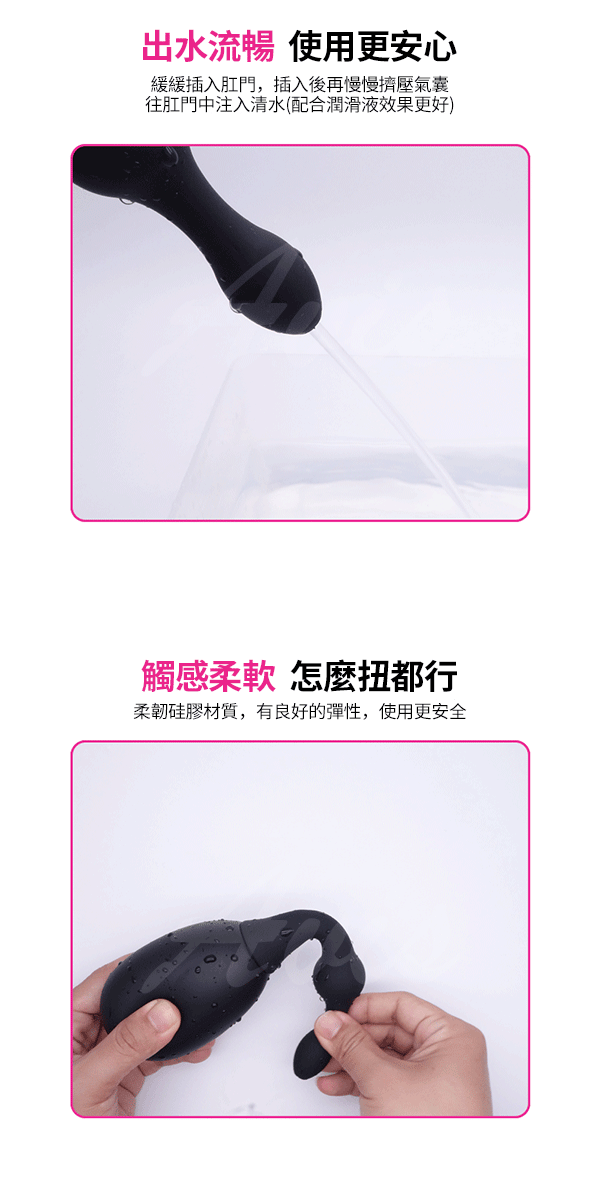 用於肛門清洗時,只要將清洗液倒入儲液囊內,當塞入肛門內後,擠壓儲液囊,則清潔液將在噴水孔噴射而出,如此不但能輕易的將後庭清洗乾淨,更造成另一特殊的風味;當然你也可以注入溫水,享受那有如射精一般的高潮與刺激。