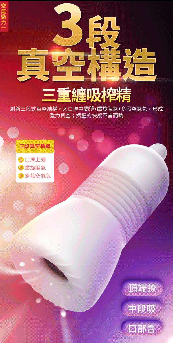 運用幻覺空氣動力構造,推動高潮的進步,給你非同一般的享受爽到欲拔不能~擁有三段負壓真空構造形成強力真空及厚重真實的包裹著老二感增加摩擦感猶如迷失在幻境通道般。採用虛擬膚質材質,柔軟Q彈享受肌膚舒適快感更加銷魂真實練就不倒金剛槍。