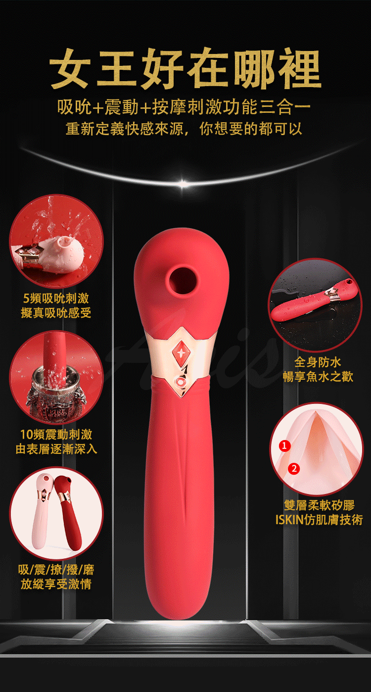如果你想要通過刺激陰蒂體驗潮吹的神仙感覺,S4女王是你最好的選擇,她能滿足你們所有對潮吹的想像。和市面上所有吸震玩具一樣,它也是一款通過吮吸和震動來刺激陰蒂引爆高潮的玩具。但是S4女王是一款經過改良後能超越他們的神器。全身非常柔軟,內置5種吮吸10種震動強度,自主選擇吮吸力度大小,能由外至內地傳遞震顫快感,讓你能夠達到高潮至潮吹快感。