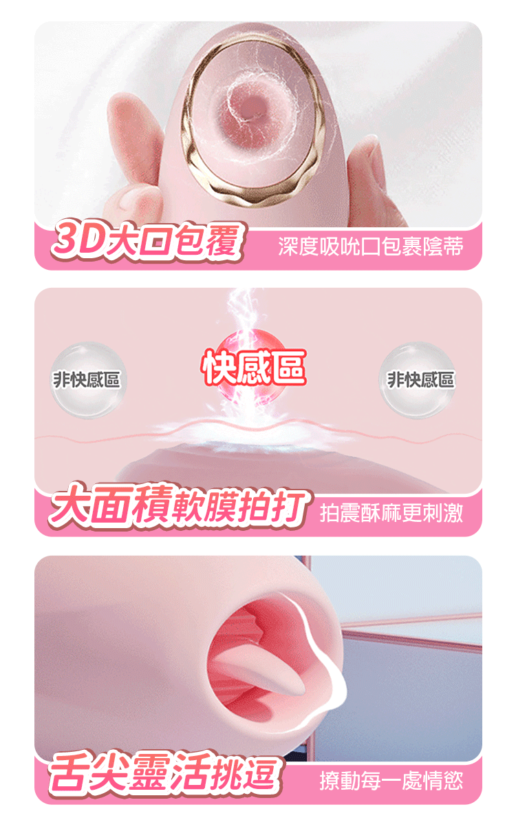 集吸吮、舌舔、拍打震動於一體,一次解鎖多重快感!