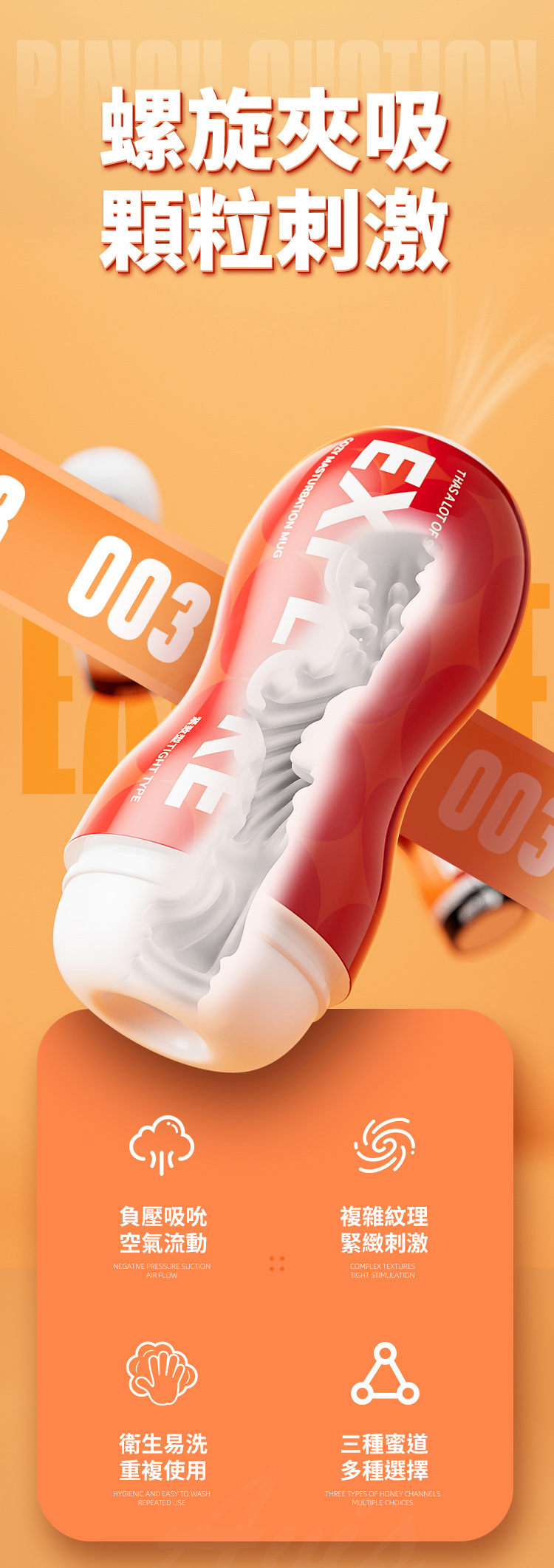 內部立體螺旋構造搭配密集刺激顆粒,360°包覆刺激,像被緊緊纏住、每寸都在酥麻跳動!